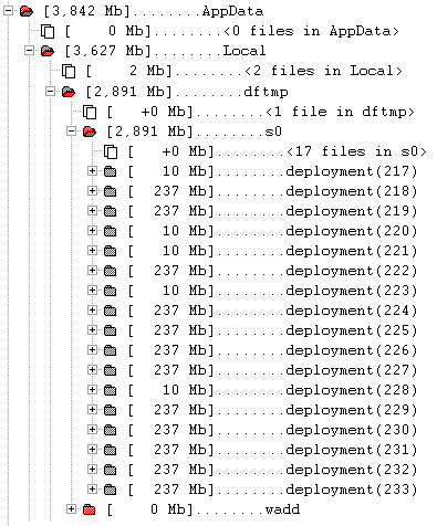 During development of an Azure application, I noticed that my disk kept running full. First time it happended, I thought nothing of it and just ran disk cleanup to clear out some obsolent files. Problem solved. At least, so I thought. Some hours later, I got a disk full warning once again. It turned out that it was caused by old local DevFabric deployments that used up disk space. Even though the deployments have been shut off, the deployment files lingered on. This is how the %USERPROFILE%AppData directory looked like: