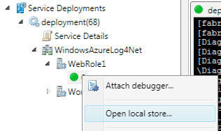 Now it’s time to run the application to see if the logging works. First, deploy to devfabric, and then open the Windows Azure Compute Emulator. Right-click on the running instance, and click on Open local store....