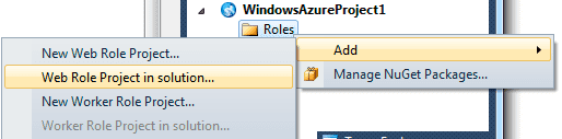 3. Right-click on the Roles-folder of the newly created Azure project and select Add->Web role project in solution... to add the web application project as an Azure Web role.