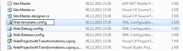 <None Include="Web.template.config" />Then, change the text of the DependentUpon element to read Web.template.config instead of Web.config. Finally, change the Content elements for for Web.Debug.config and Web.Release.config to None elements. This prevents these files from being included in the deployment package. They don’t need to be, as the transformations have already been run. All in all, the snippet from above should now read: