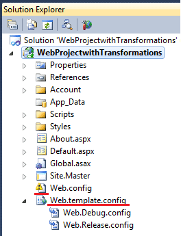 </Target>Save the file and reload the project into the Visual Studio solution. Then, in the Solution Explorer, observe that the Web.config file now is denoted as missing, and that the Web.template.config is present with the two transformation files beneath it in the file tree: