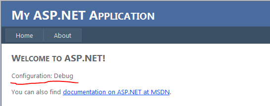 }Hit F5 to run the application and verify that it in fact is able to read from the transformed Web.config: