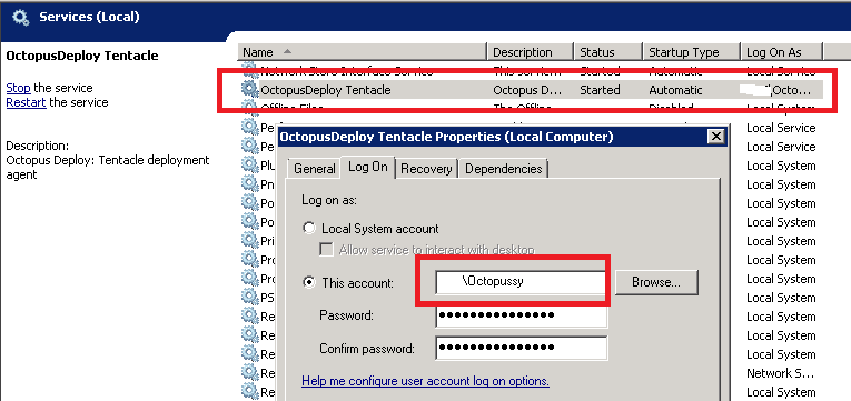net localgroup administrators domain1\octopussy /addIn order for the Octopus Deploy tentacle to be able to run the deployment, the tentacle service must run as the aforementioned user account: