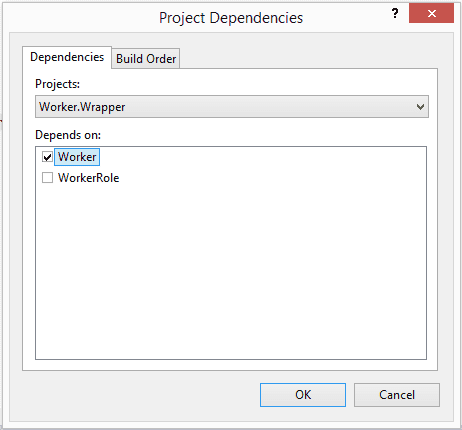 We have to make sure that the WorkerRole project is built before our wrapper project, so we make sure the build order in the solution is correct:
