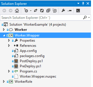 Install-Package OctoPack -ProjectName Worker.WrapperWe’re almost set. Like I said earlier, the Wrapper project is a console project, but we are not really interested in a console application. So in order to remove all unnecessary gunk from our deployment package, we specify a .nuspec file where we explicitly list the files we need in the package. The .nuspec file name is prefixed with the project name. In this case, Worker.Wrapper.nuspec, and it contains: